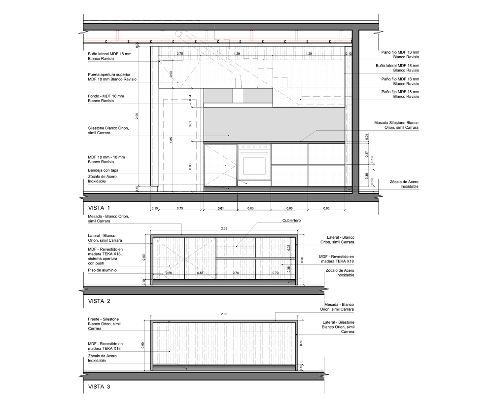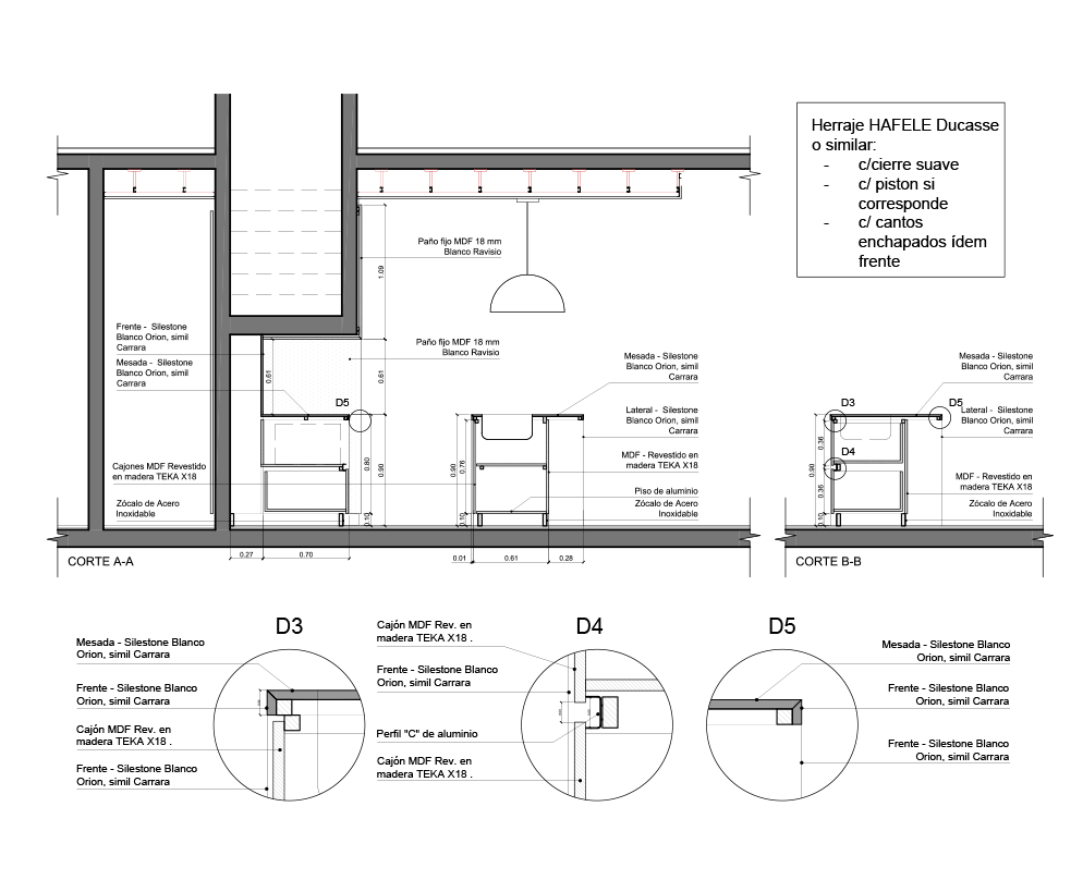 El desafío del proyecto constaba en armar una cocina en el bajo escalera para ganar espacio pero dándole prioridad a las visuales. Se eligieron placas antirayas y enchapados en madera natural. El marmol de carrara era el preferido del cliente y se repite en baños de PA .
